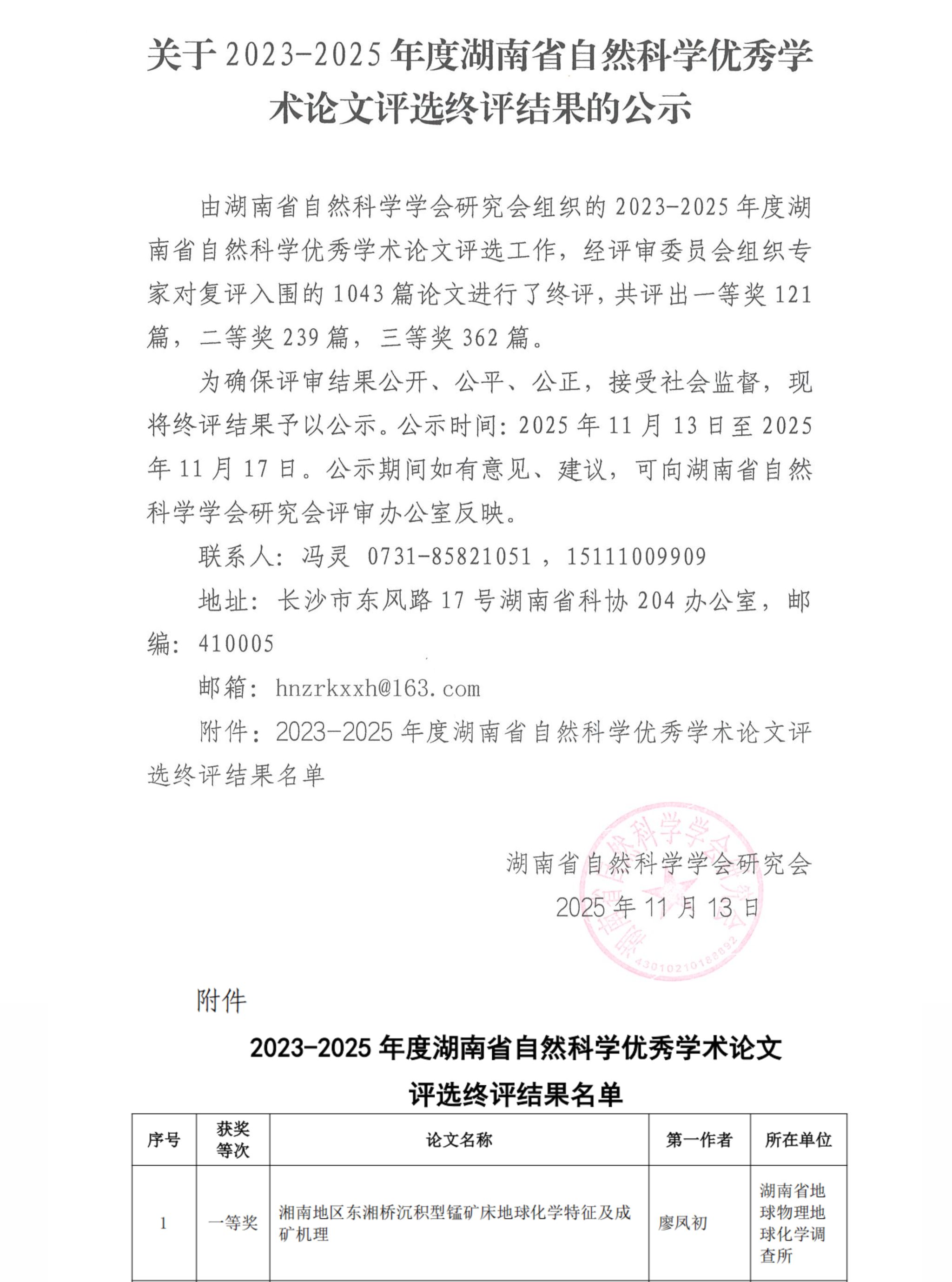 近日,2023-2025年度湖南省自然科学优秀学术论文终评结果公示,bevictor1946韦德官网岩土力学与地质过程团队刘湘华老师作为通讯作者的学术论文《湘南地区东湘桥沉积型锰矿地球化学特征及成矿机理》荣获一等奖。