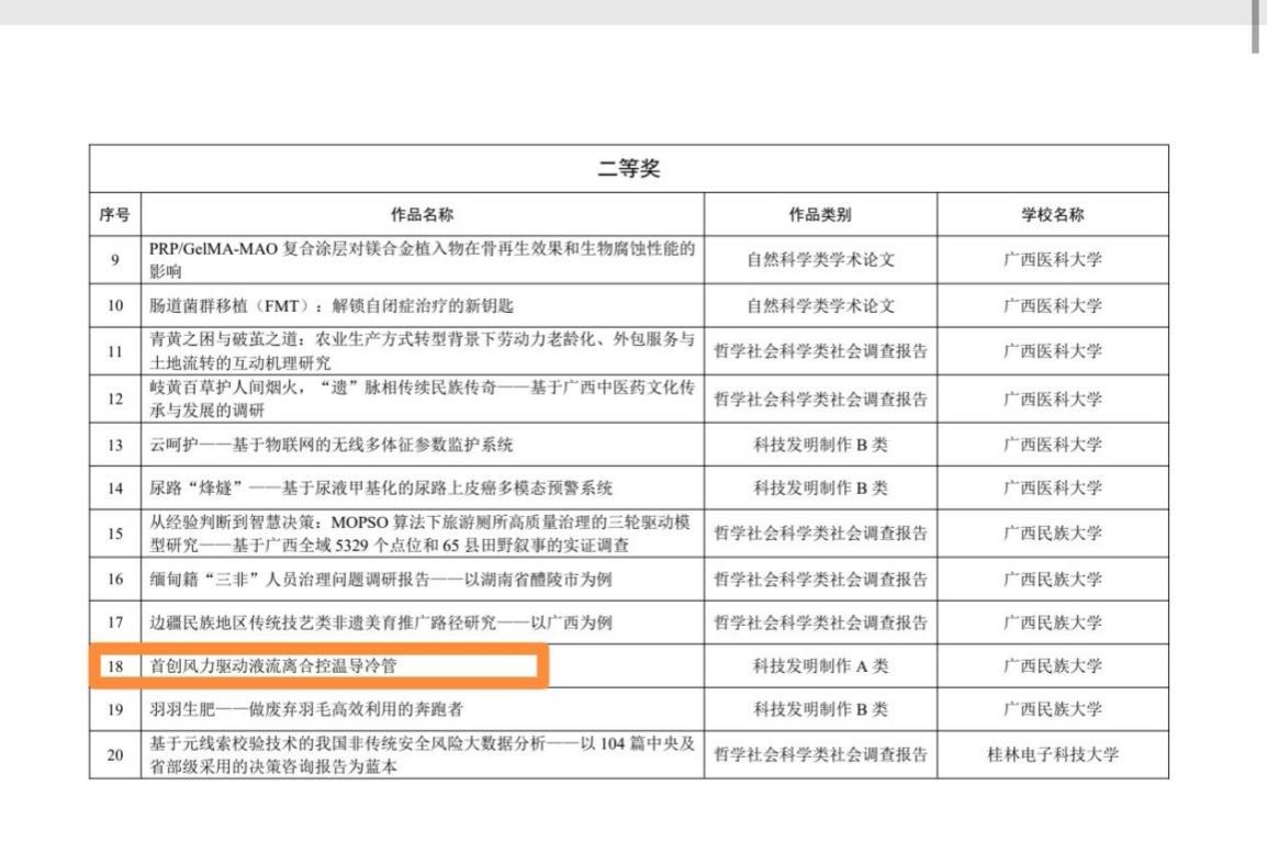 近日,第十二届“挑战杯”广西老员工课外学术科技作品竞赛结果揭晓,bevictor1946韦德官网参赛团队凭借原创项目“首创风力驱动液流离合控温导冷管”荣获科技发明制作A类二等奖,为公司科技创新成果再添重要荣誉。